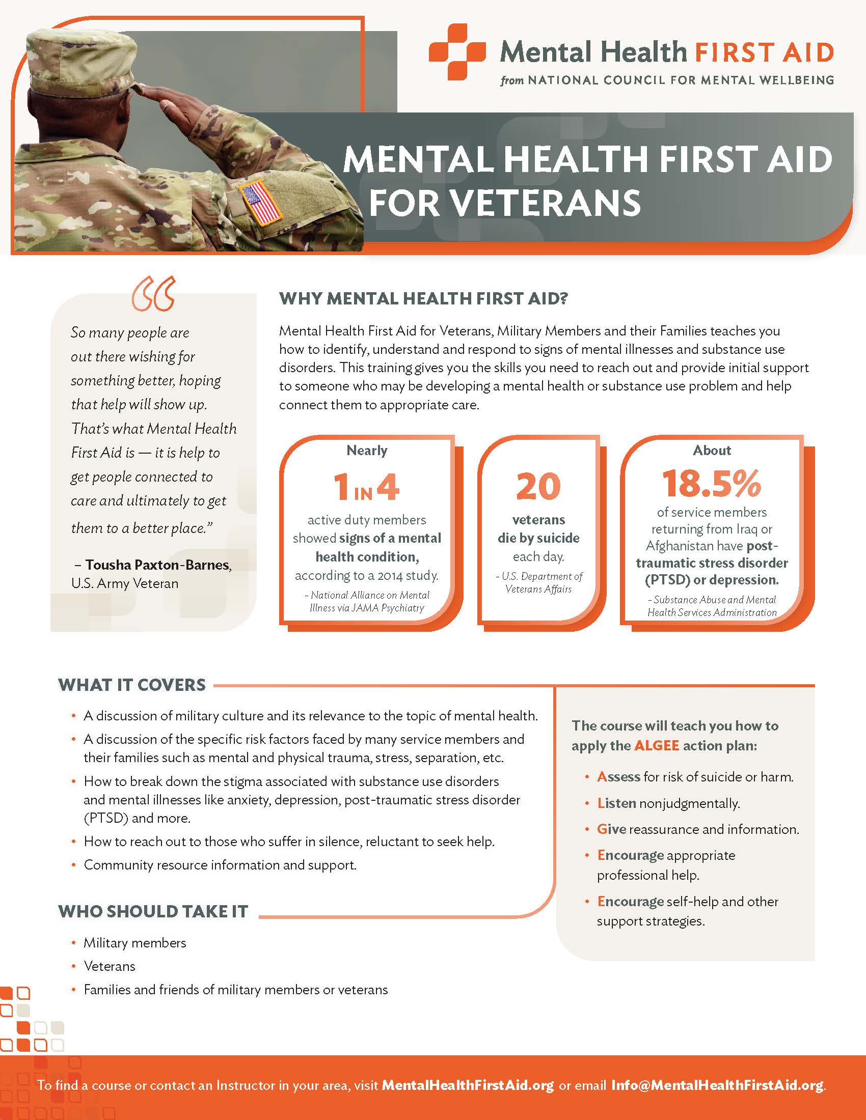 For some members of the military, the battle doesn’t end when they leave the battlefield. Mental Health First Aid for Military Members, Veterans and their Families teaches people how to notice and respond to signs of mental health and substance use challenges with a specific focus on the cultural factors related to military life. This training is appropriate for Active Duty, Veterans, family members, clinicians, and anyone else who works with Veterans.